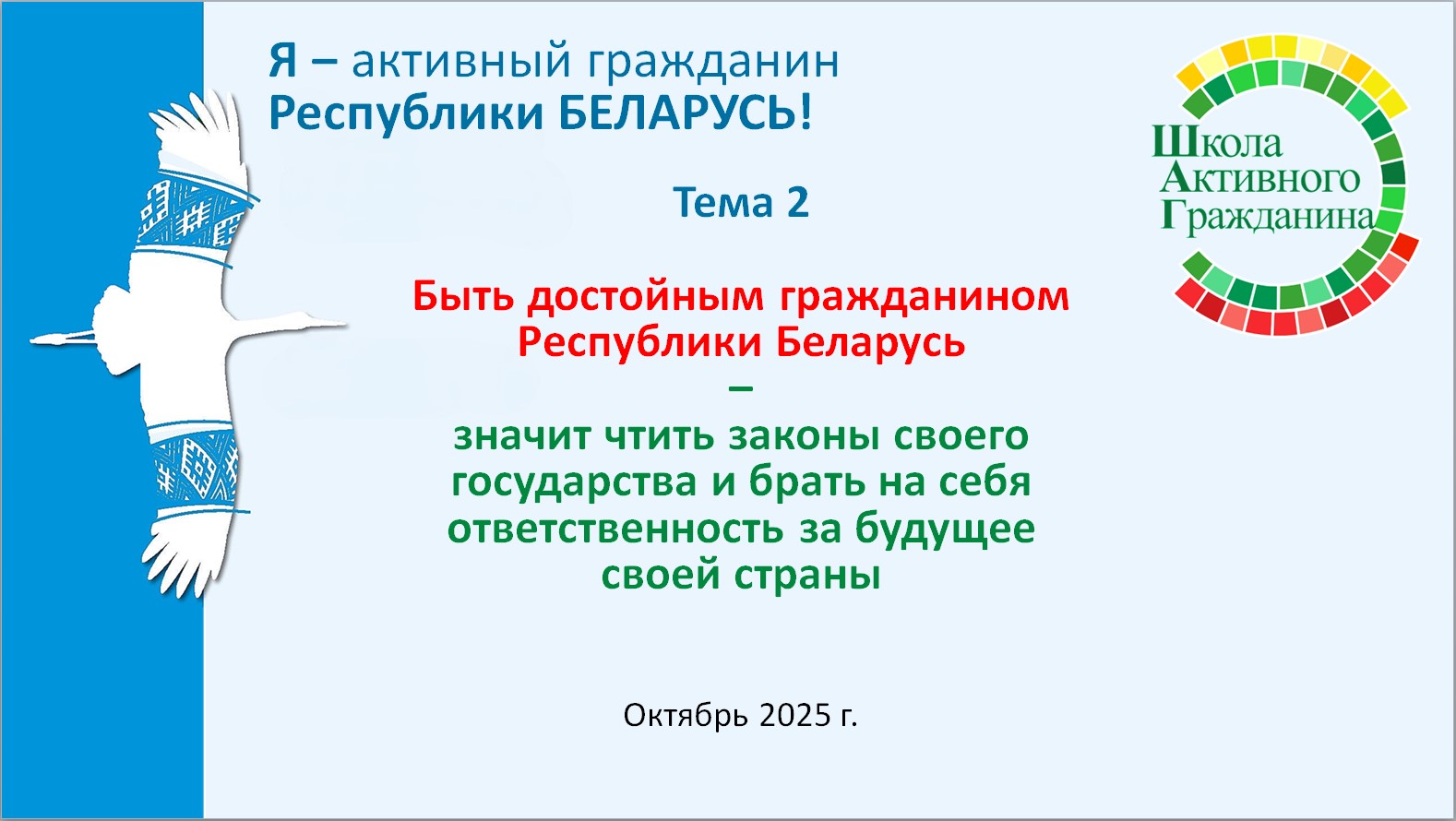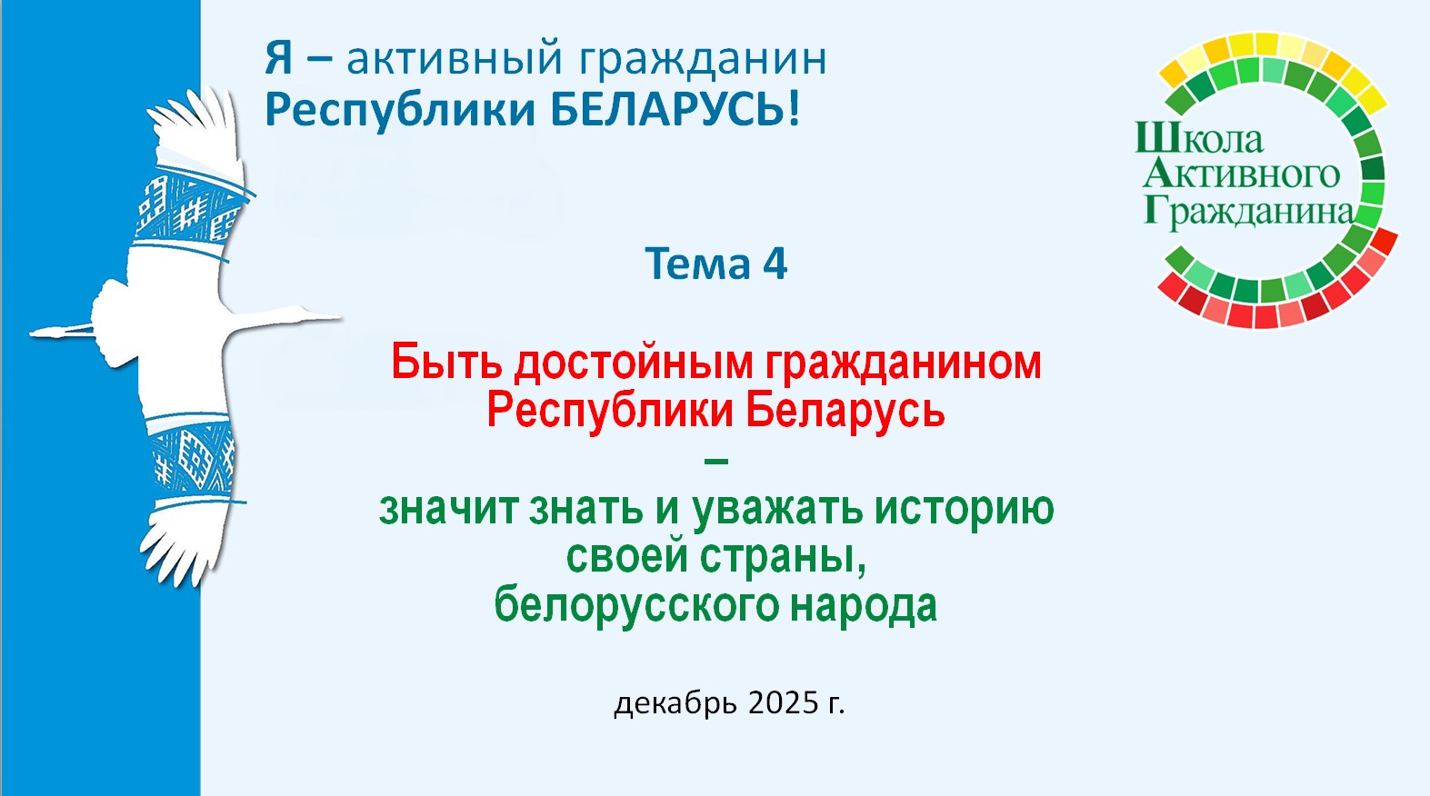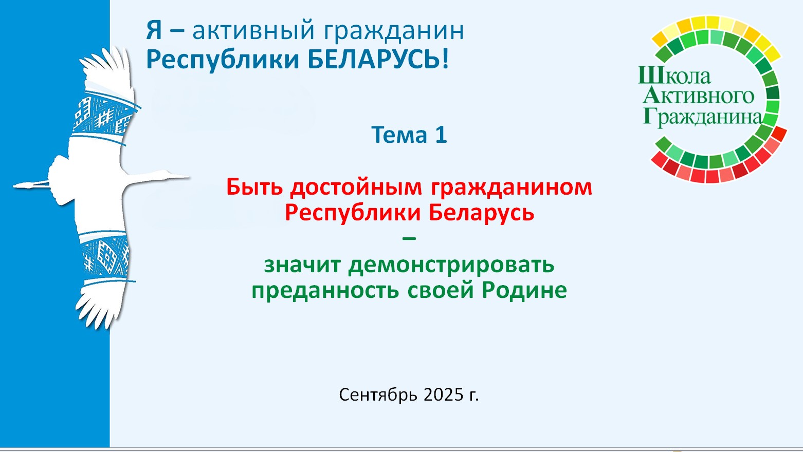 Ключевая идея информационно-образовательного проекта «ШАГ» – «Школа Активного Гражданина» в 2025/2026 учебном году – «Быть достойным гражданином – значит быть активным гражданином Республики Беларусь!».