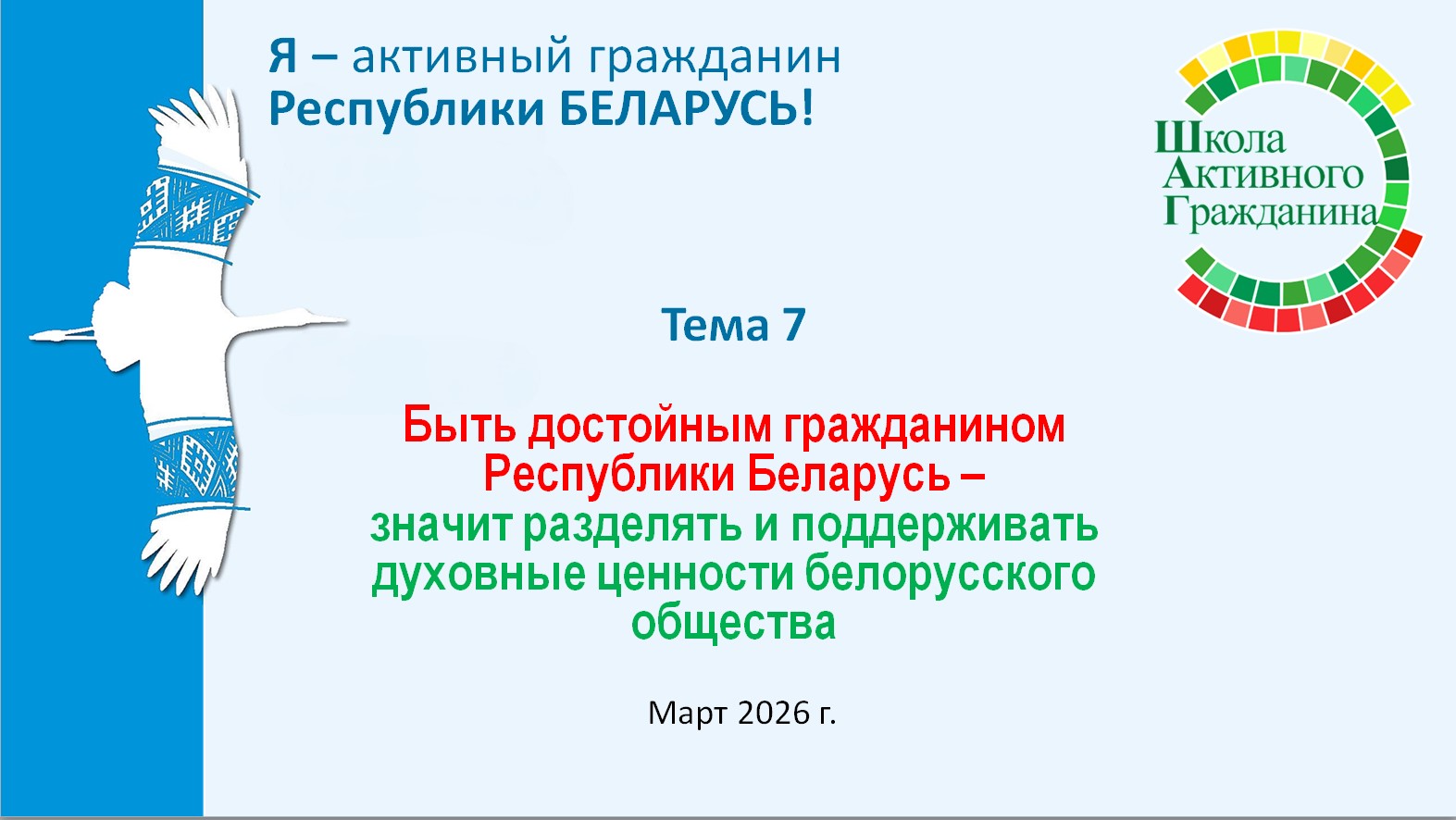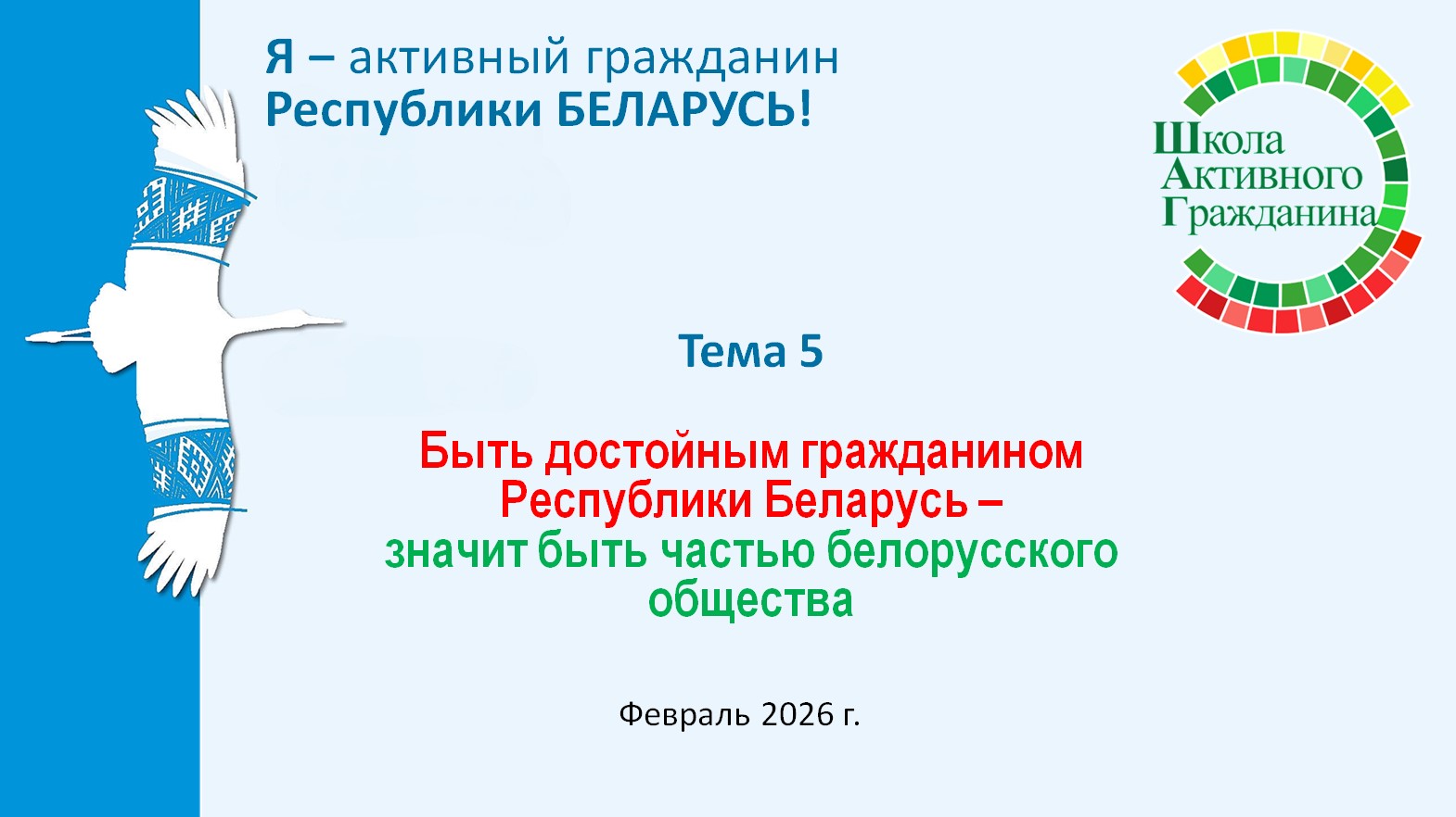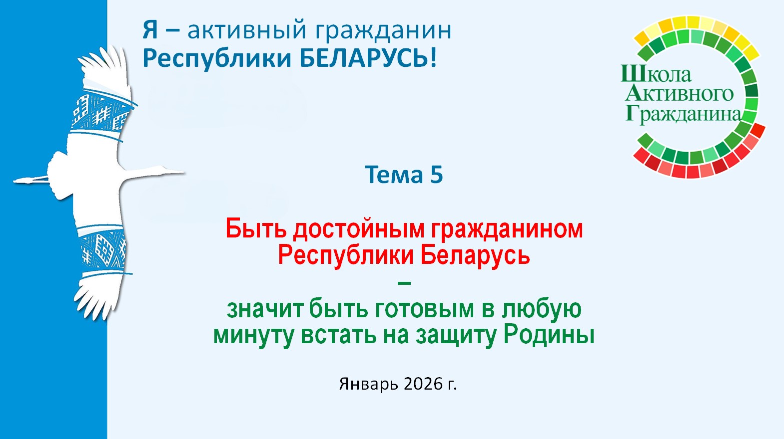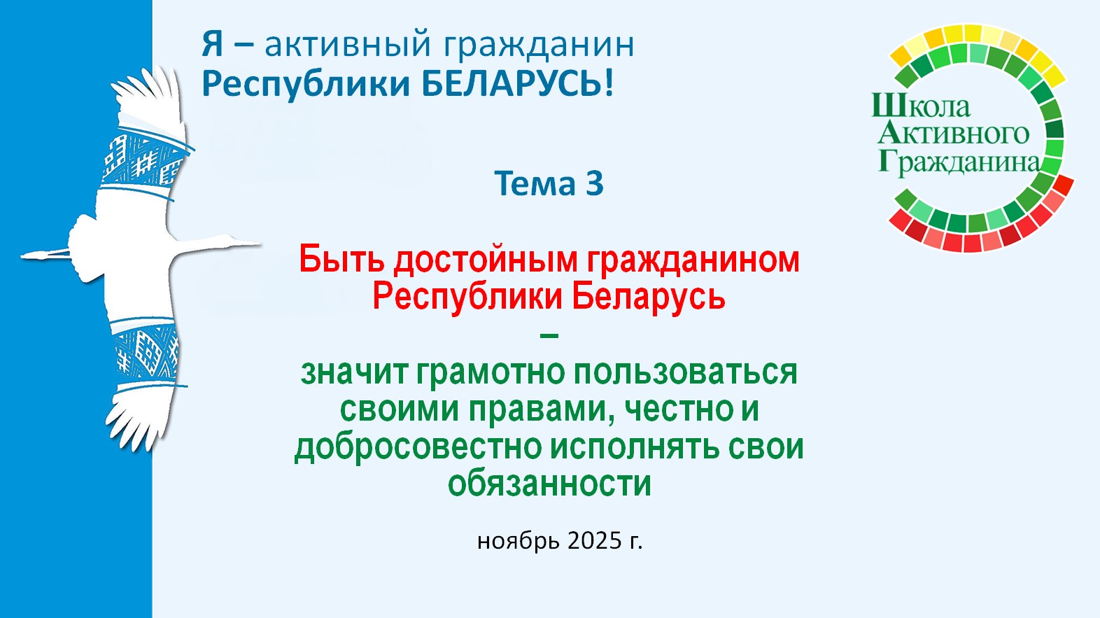 Ключевая идея информационно-образовательного проекта «ШАГ» – «Школа Активного Гражданина» в 2025/2026 учебном году – «Быть достойным гражданином – значит быть активным гражданином Республики Беларусь!».