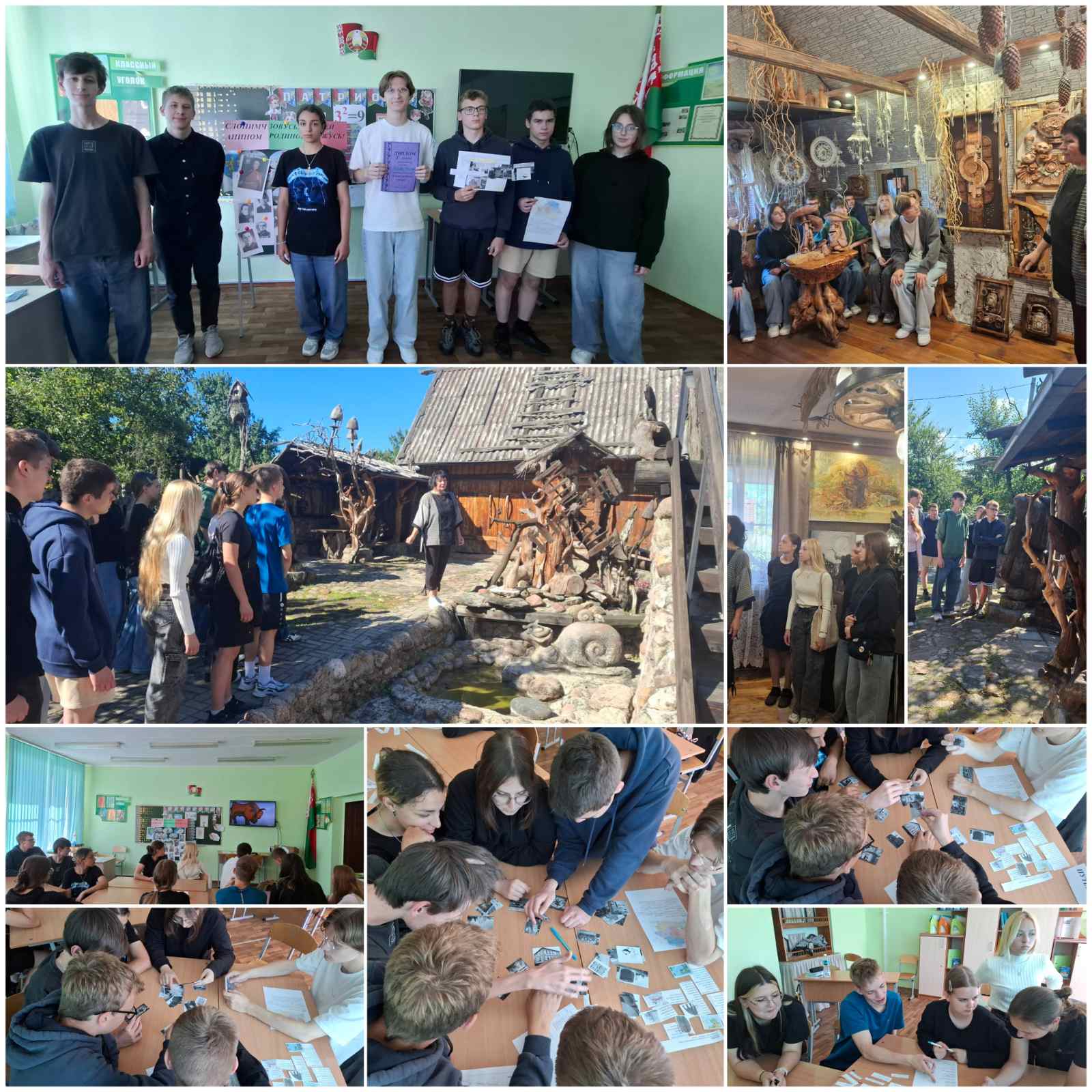 В восхищении остались все от творчества этой талантливой женщины и её семьи. При входе во двор посетителей встречают деревянные скульптуры, качели, беседки, которые сделаны из дубовых лесных коряг – это экологическое хобби хозяйки дома. На первом этаже дома расположилась комната-выставка картин, написанных в необычных техниках. Сама мастерская находится на мансарде дома. Вот в ней и происходят настоящие чудеса , сделанные руками и фантазией Надежды. Из глины и натуральных материалов она создаёт свои удивительные произведения. Также Надежда прекрасно поёт и сочиняет музыку на свои стихи. Ребятам посчастливилось услышать исполнение некоторых песен.