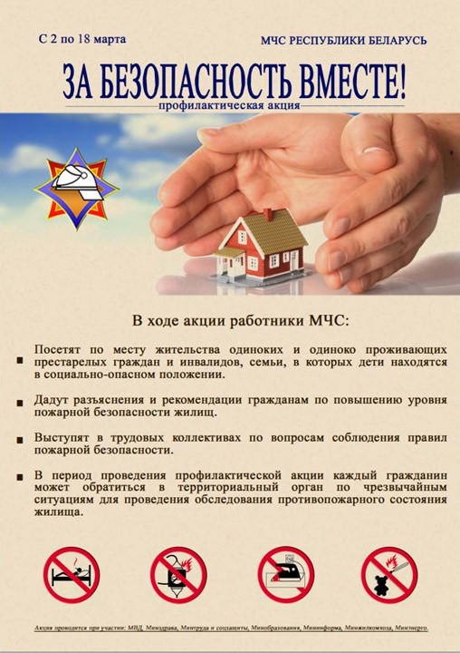 С 7 по 15 марта в Слонимском районе пройдет масштабная республиканская акция «За безопасность вместе!». Пожарно-профилактическая инициатива направлена на предупреждение пожаров и гибели людей от них в жилищном фонде, а также повышение осведомленности населения о мерах пожарной безопасности, возможностях государственных организаций по оказанию услуг в сфере обеспечения безопасности, укрепление правопорядка и предупреждение правонарушений, совершаемых гражданами в состоянии алкогольного опьянения.