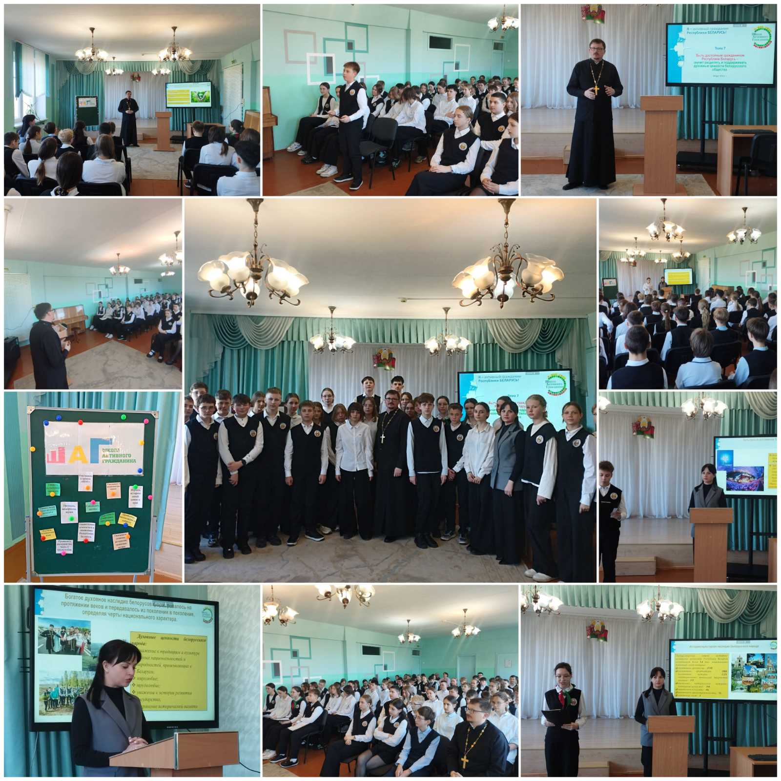 В ГУО "Средняя школа №10 имени В.И.Пеленицына г. Слонима" состоялось мероприятие республиканского проекта ШАГ на тему "Быть достойным гражданином Республики Беларусь - значит разделять и поддерживать духовные ценности белорусского общества". Особую значимость мероприятию придал визит почётного гостя - священника отца Сергия Ярмоловича, клирика Свято-Троицкого собора. В рамках ШАГа 1 "Мы узнаем" учащиеся актуализировали знания о значении и содержании понятий "духовные ценности", "национально-культурное наследие", "семейные ценности". В ходе обсуждения учащиеся ответили на вопросы о духовных ценностях белорусского народа, историко-культурном наследии и роли семейных традиций.